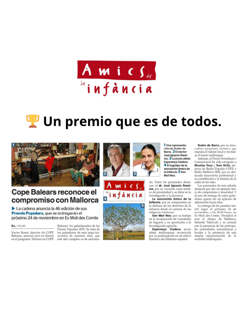 Gracias a COPE Mallorca por este reconocimiento que sentimos como un aplauso colectivo a toda la familia de Amics de la Infància: voluntarios, socios, colaboradores, padrinos y entidades que nos acompañáis desde hace casi 30 años.